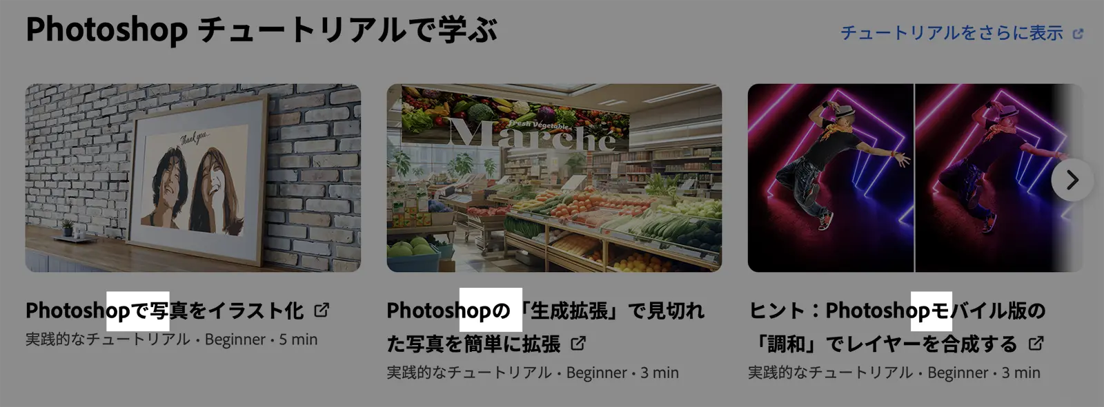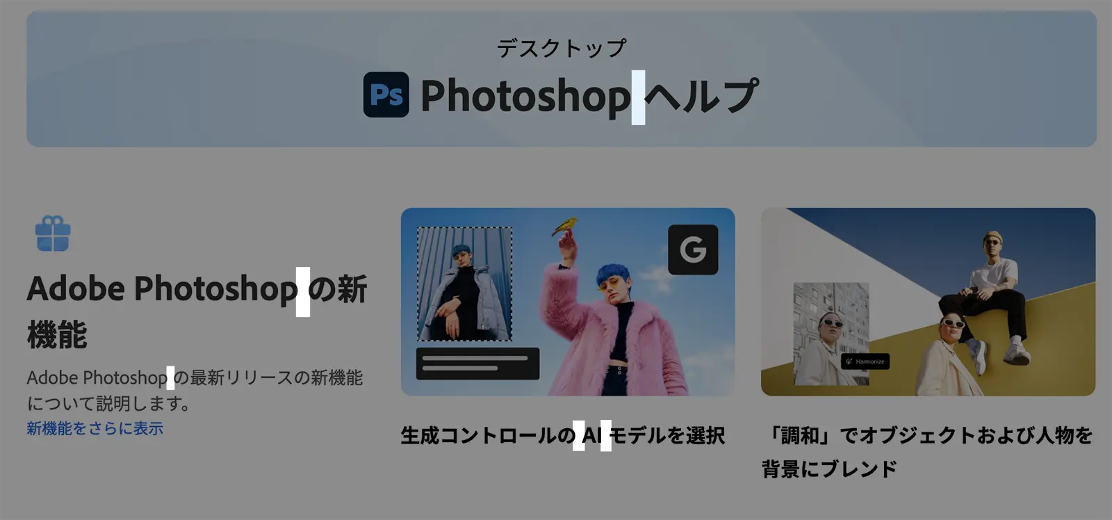 「Photoshop デスクトップヘルプ」ページ内で下にスクロールすると、半角スペースのないテキストが見つかる